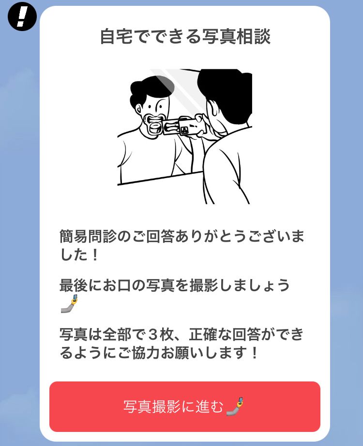 のメニュー「写真相談」をタップしていただき、まずは簡易問診に回答してください。その後、写真撮影に進みます。