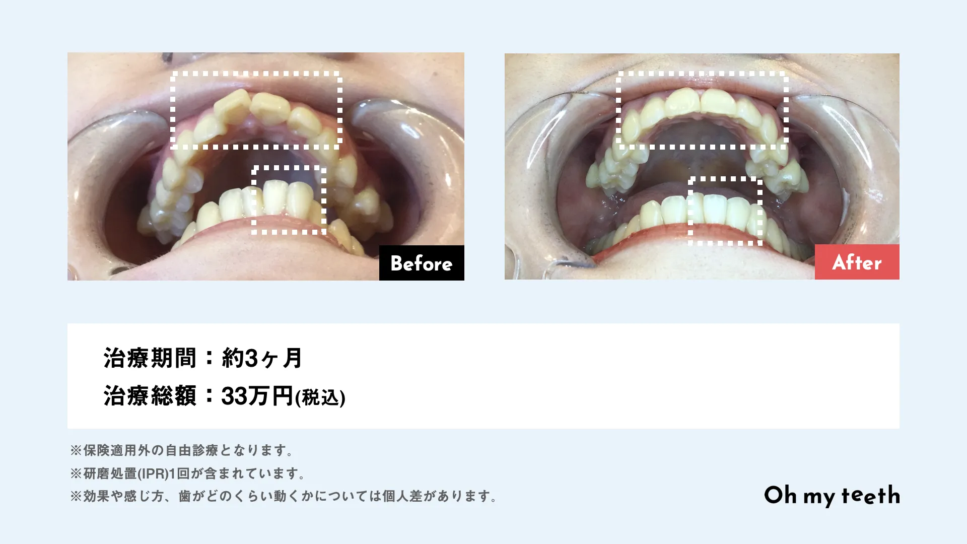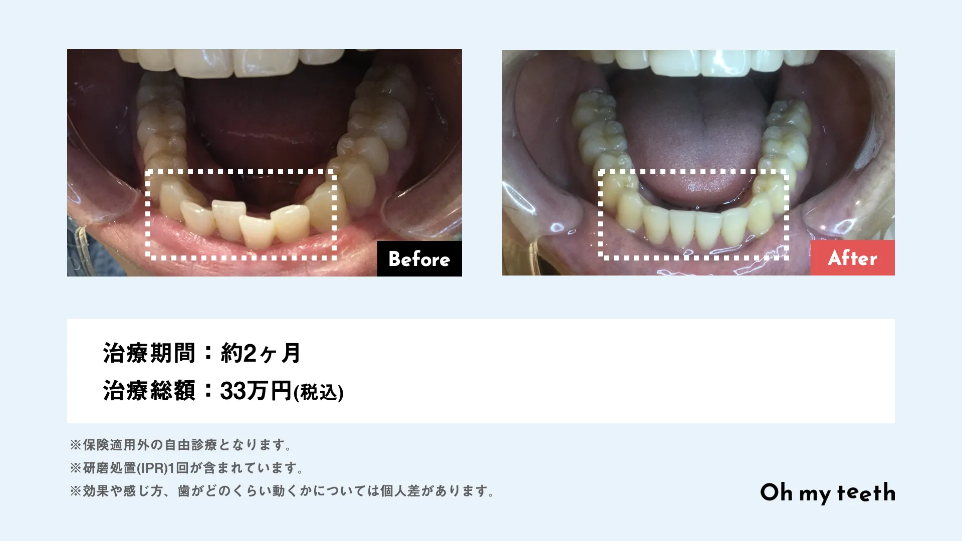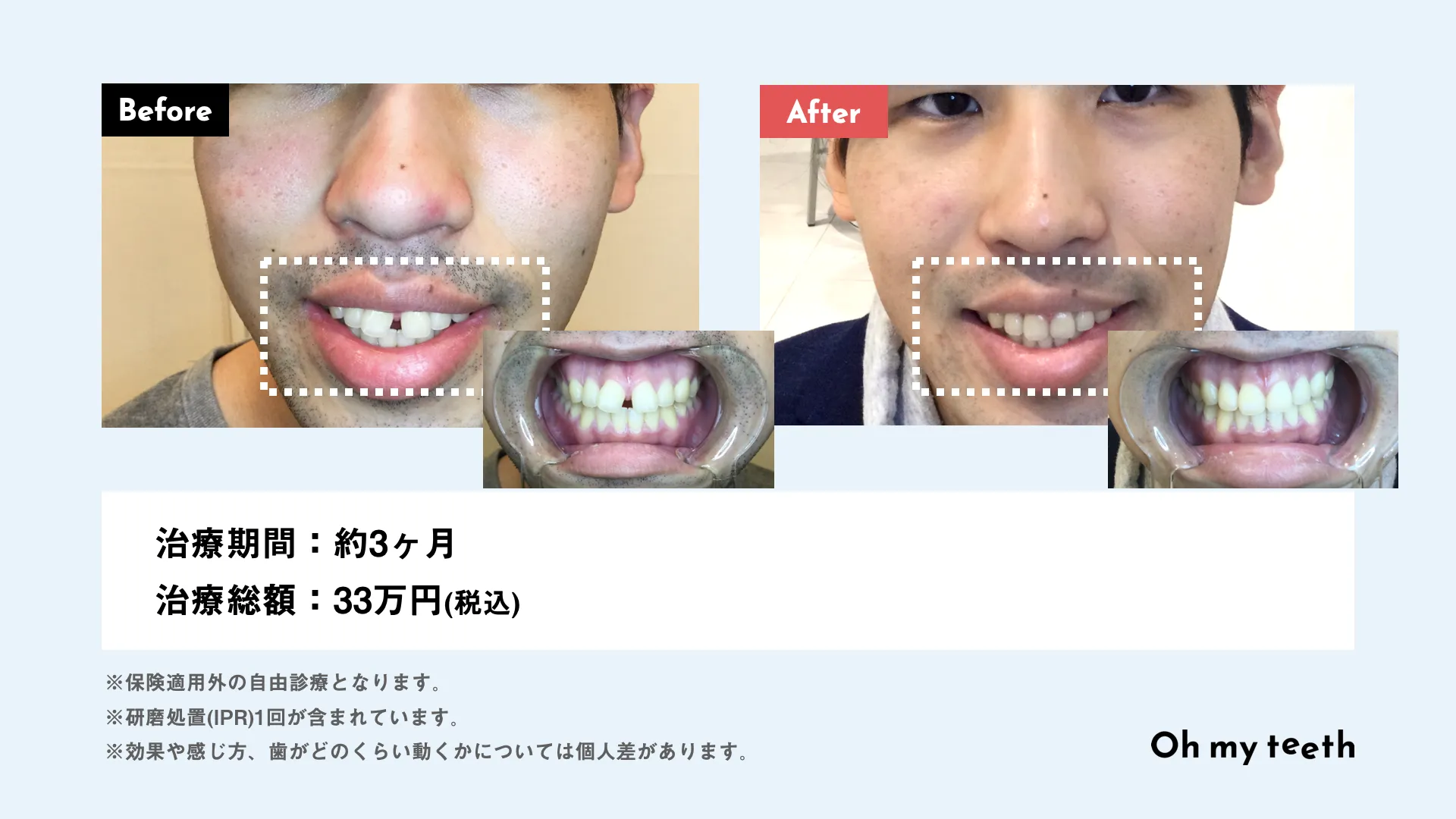 Oh my teethは、軽度から中度の症例に特化した歯科矯正サービスです。軽度の前歯のがたつき、出っ歯、すきっ歯、以前矯正された方の後戻りなどに対応しています。