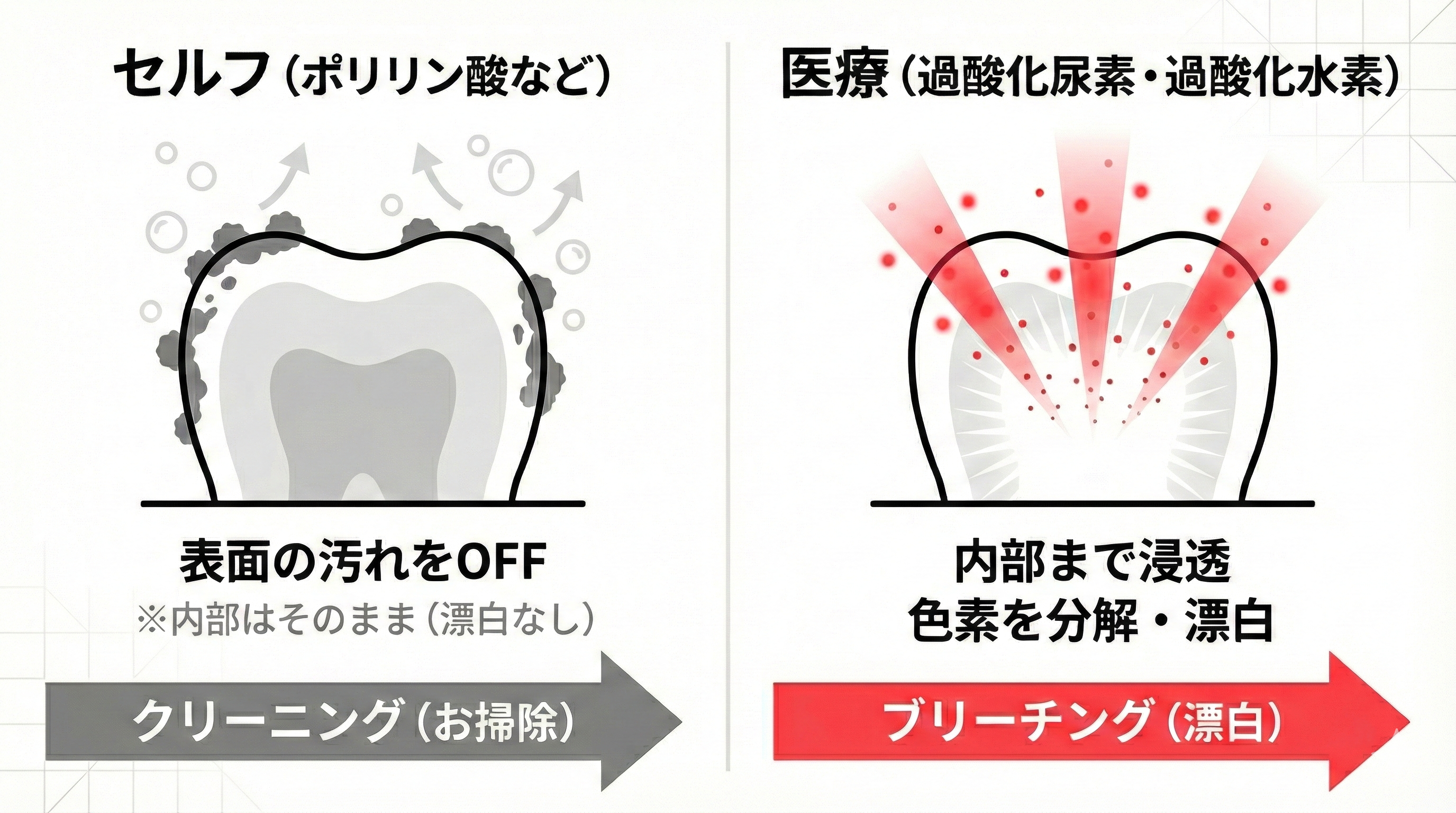 作用 | 表面の汚れを落とす(クリーニング) | 色素を分解する(ブリーチング) |