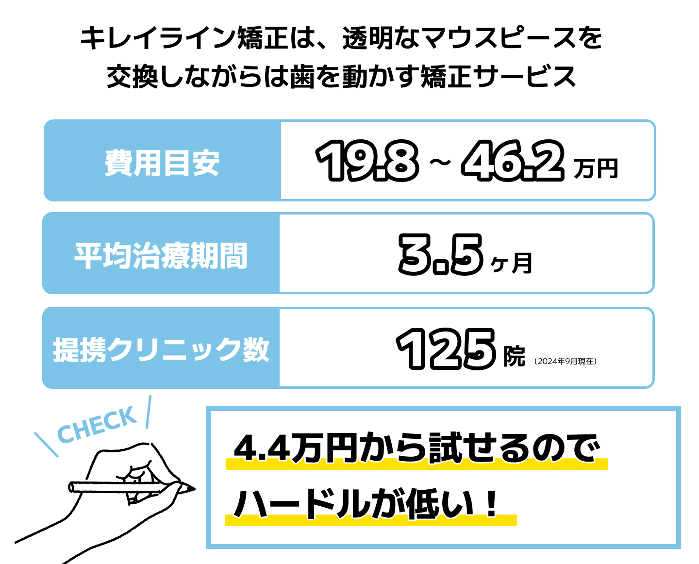 初回4.4万円(税込)で「最初の1回分のマウスピース治療」をお試しでき、自分に合っているか確認してから継続を判断できます。