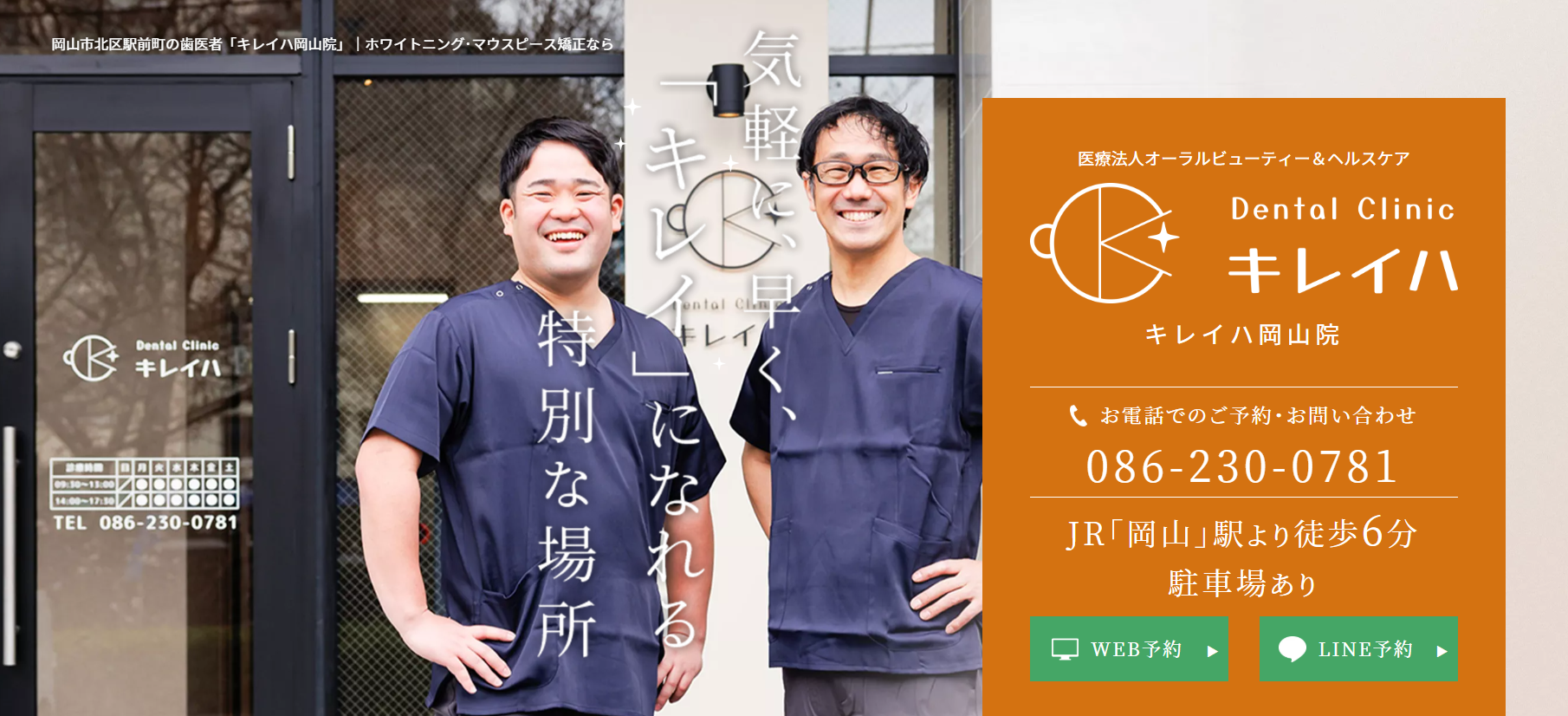 キレイハ岡山院は岡山駅から徒歩約6分、カフェのような空間でスピーディーなスピード矯正にも対応した、アクセス・雰囲気・機能性がそろった歯科クリニックです。