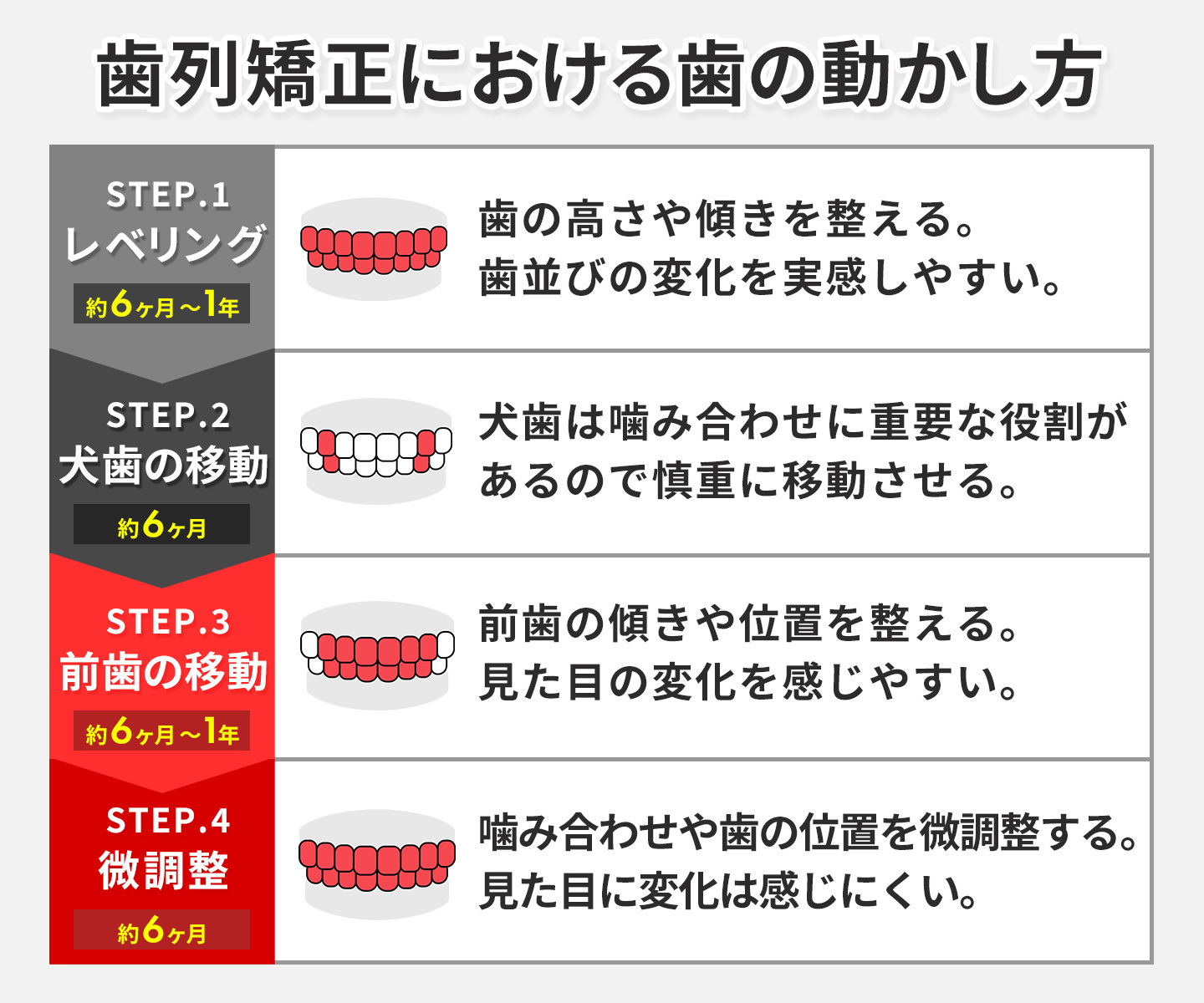 歯列矯正は1ヶ月で0.3~0.5mm程度動かせますが、どのような流れで歯が動くのか理解していないと「動いた気がしない」と不安になるものです。特に抜歯を必要とするワイヤー矯正は、治療期間が約3年かかることもあります。