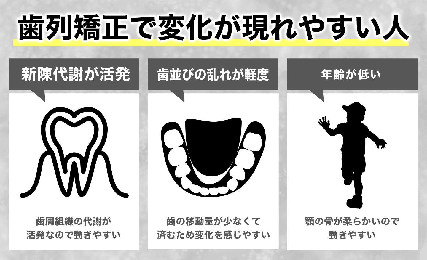歯は歯根膜の伸縮と骨の代謝を利用して動かすため、新陳代謝が活発な人は歯が動きやすい傾向にあります。