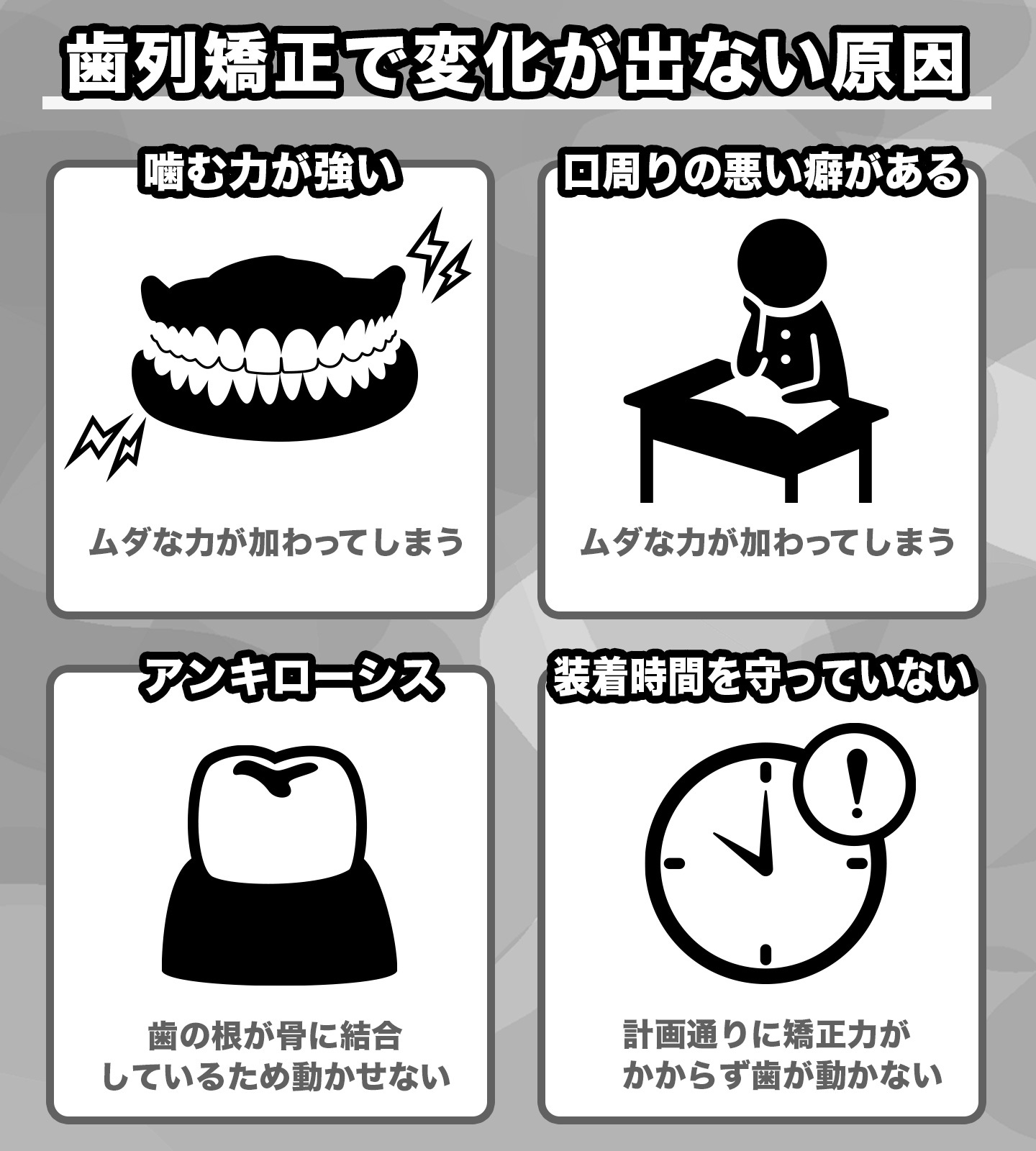 歯が動くスピードは、個人差があるため、1ヶ月で歯が動かなくても焦る必要はありません。しかし、数ヶ月経っても歯が動かない場合は、以下の原因が考えられます。