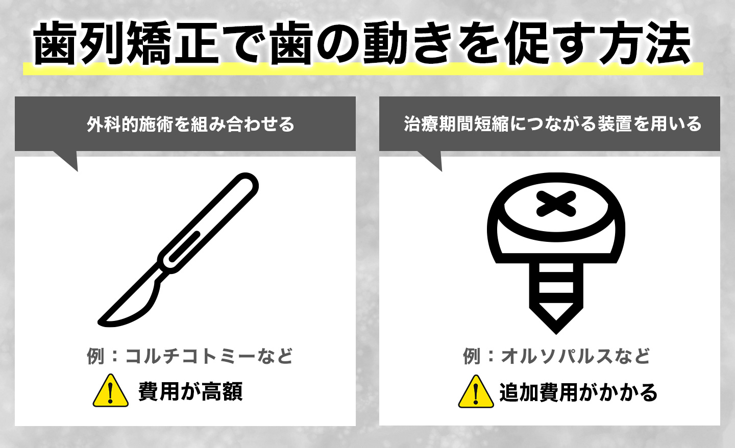 「できるだけ早く歯列矯正を終わらせたい」と考える方は多いです。歯列矯正と以下の方法を併用することで歯を速く動かせます。ただし、歯科医院によって取り扱っていないところもあるので、事前に確認する必要があります。