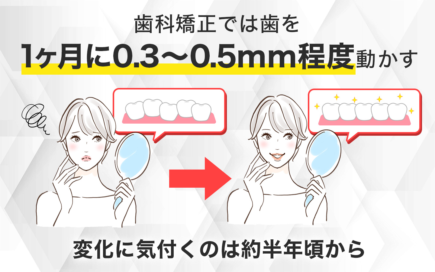 - 歯列矯正は1ヶ月で0.3~0.5mm程度歯が動く
