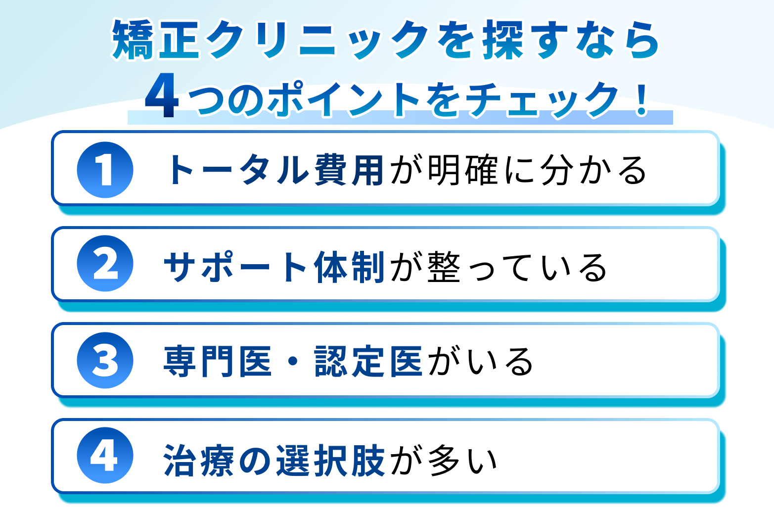 ここからは、矯正歯科を選ぶ際にチェックしておきたい4つのポイントを解説します。