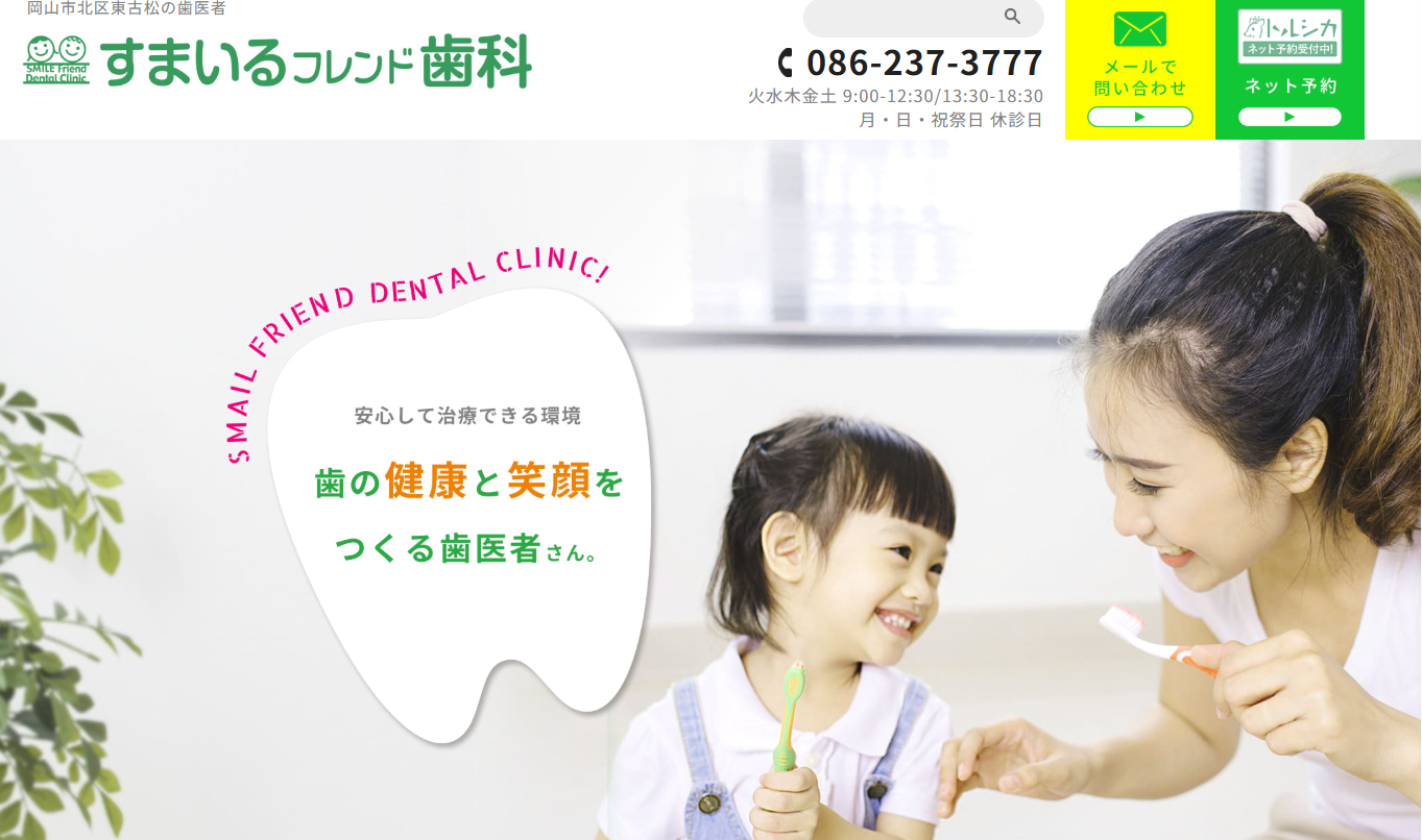 すまいるフレンド歯科は岡山市北区東古松にある地域密着の総合歯科クリニックです。矯正治療を含めた幅広い診療に対応し、キッズクラブなど予防プログラムも充実しています。